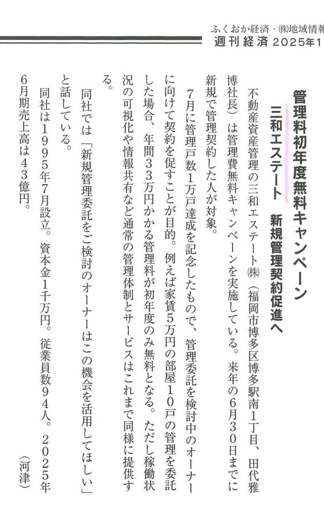 当社が実施中の「管理料初年度無料キャンペーン」が掲載されました。